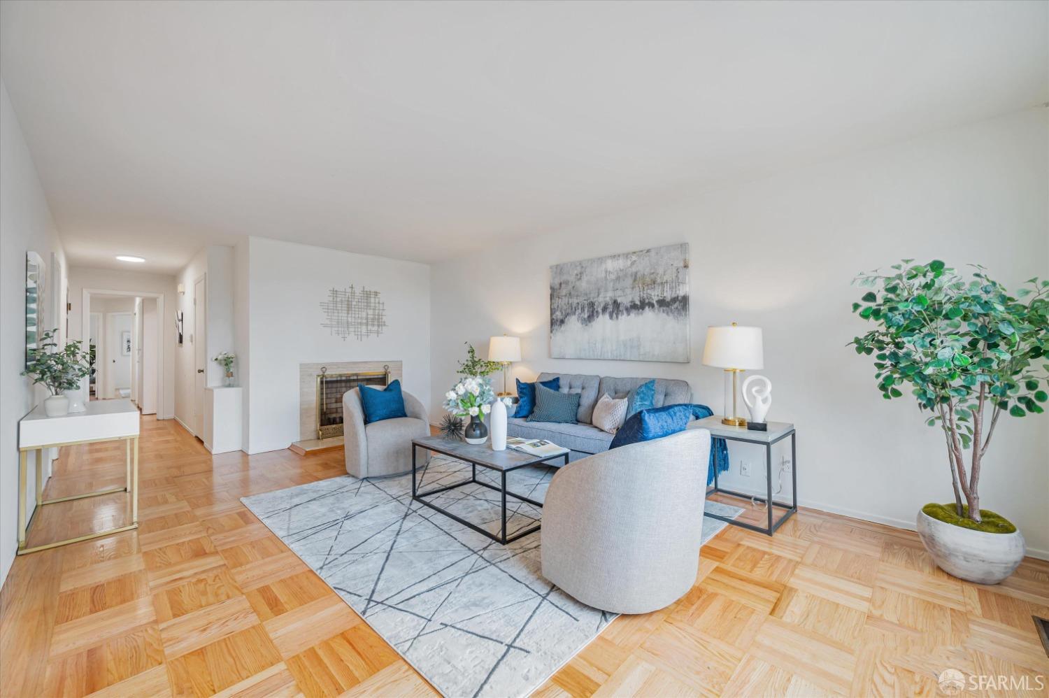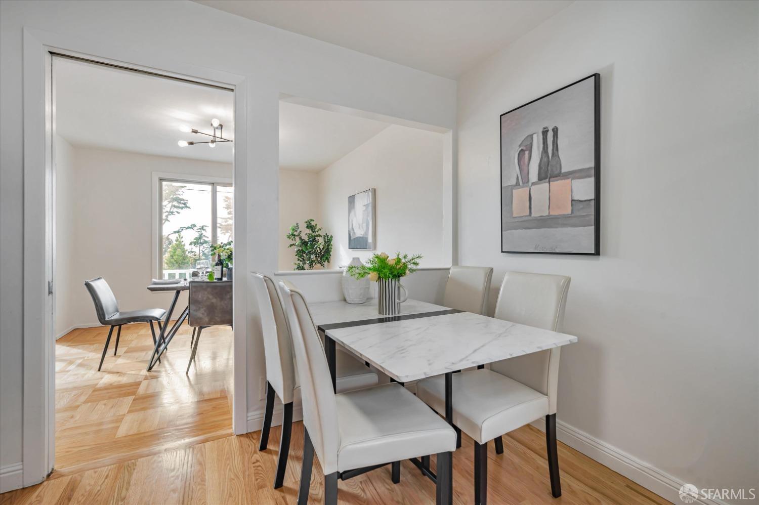 Located on a charming tree-lined block in Parkside, this tunnel-entrance home is just a few blocks from Noriega Street's shops and restaurants, public transit along Sunset Boulevard, Quintara St, and Noriega St, as well as several schools - including two elementary schools, a middle school, and a private high school within several blocks away. West Sunset Playground and Ocean Beach are within sight. The home features a well-desired layout with 3 bedrooms & 2 bathrooms (including primary suite), a private deck, a spacious living room & a dining room with partial ocean views, and a kitchen with eat-in area all on the top floor. The ground level includes a legal room with a half bath, plus an additional unwarranted room and bath. A spacious two-car tandem garage provides ample storage space and potential for future expansion. The large backyard, surrounded by lush trees and greenery, offers a private retreat. Recent updates include fresh interior and exterior paint, newly refinished hardwood floors, and new flooring in the ground-level living spaces, making this home move-in ready!