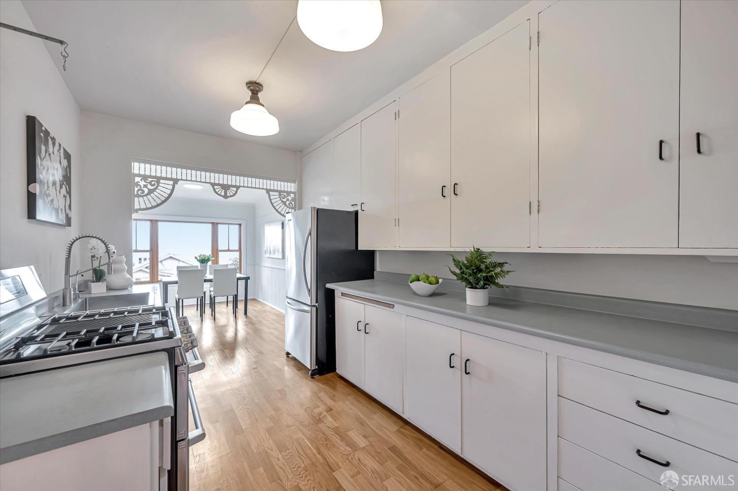 Presenting a distinctive home in Parkside, mere steps from Taraval Street MUNI lines, dining spots, shops, Parkside Square playground, Stern Grove, Pine Lake Park, Lakeshore Plaza, Lake Merced, and Ocean Beach. Enjoy the Pacific Ocean views from the top two floors, where you can enjoy sunsets from your bedrooms or both the dining room and breakfast nook. The top floor features 3 bedrooms and a full bath, including a spacious front primary bedroom and two rear bedrooms. On the main level, soak up natural light in the living and dining rooms with boxed beam ceilings & gas fireplace, accompanied by a well-appointed kitchen and breakfast nook. A large deck off the breakfast nook offers access to lower decks and a lush yard, complete with vegetable gardens and an art studio. The ground floor presents an additional unwarranted bedroom, bathroom, wet bar area, and deck via French doors, perfect for a guest suite. The garage fits 2 cars tandem and provides ample storage space with soaring ceilings for potential mezzanine use.